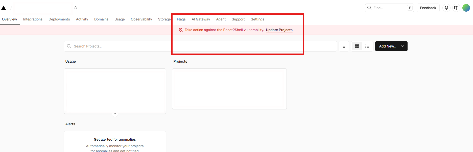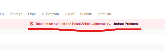 vercel에서 취약한 버전의 프로젝트를 감지하면 [vercel.com](http://vercel.com) 대시보드 상단에 경고 배너를 띄워준다.