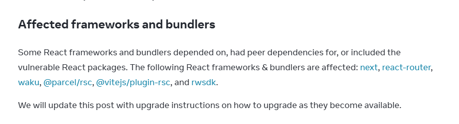 즉 이 프레임워크나 플러그인을 사용하는 프로젝트라면 직접 React RSC 패키지를 설치하지 않았더라도 취약점에 영향받을 수 있다.