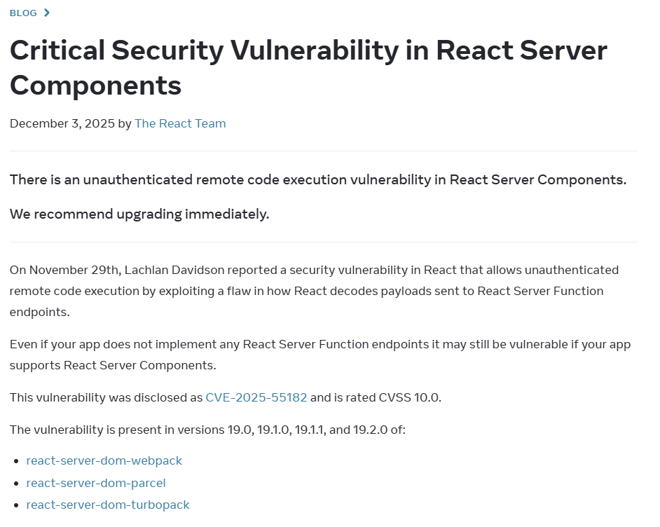2025년 12월 3일 React 공식 블로그에서 보안 관련 공지가 발표되었다.