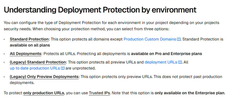 Vercel은 운영 도메인(=배포 도메인) 외의 모든 배포에 대해 ‘배포 보호 설정’을 켜라고 권장한다.