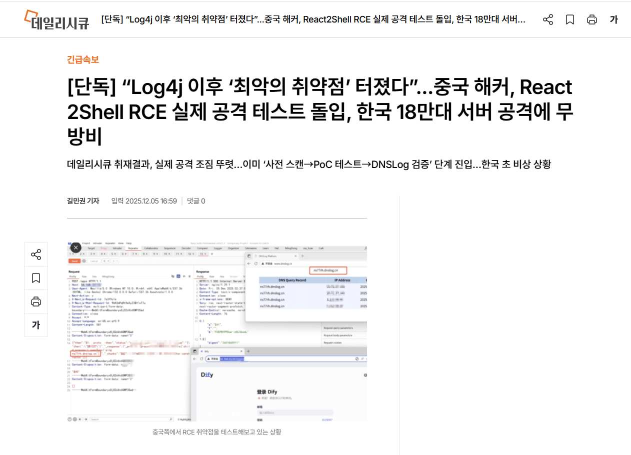 [단독] “Log4j 이후 ‘최악의 취약점’ 터졌다”...중국 해커, React2Shell RCE 실제 공격 테스트 돌입,
