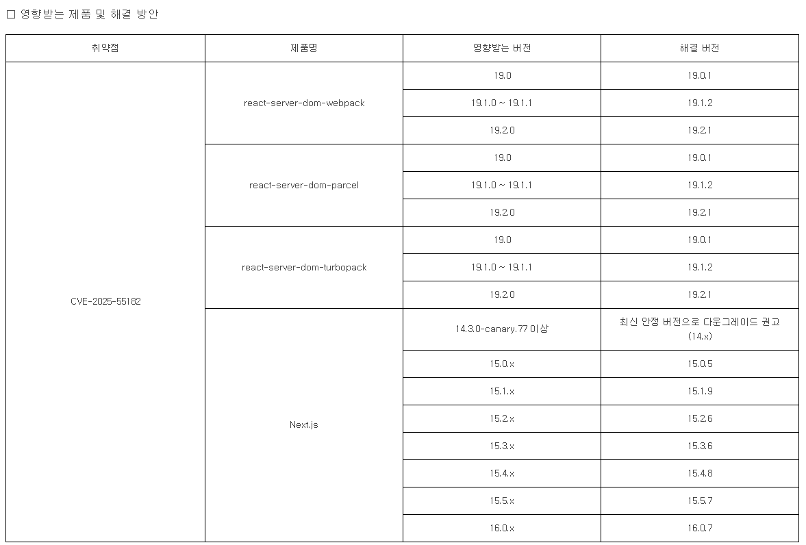 이번 취약점 문제는 React 19.x 및 해당 기능을 사용하는 모든 프레임워크(Next.js 등)에 영향을 준다.