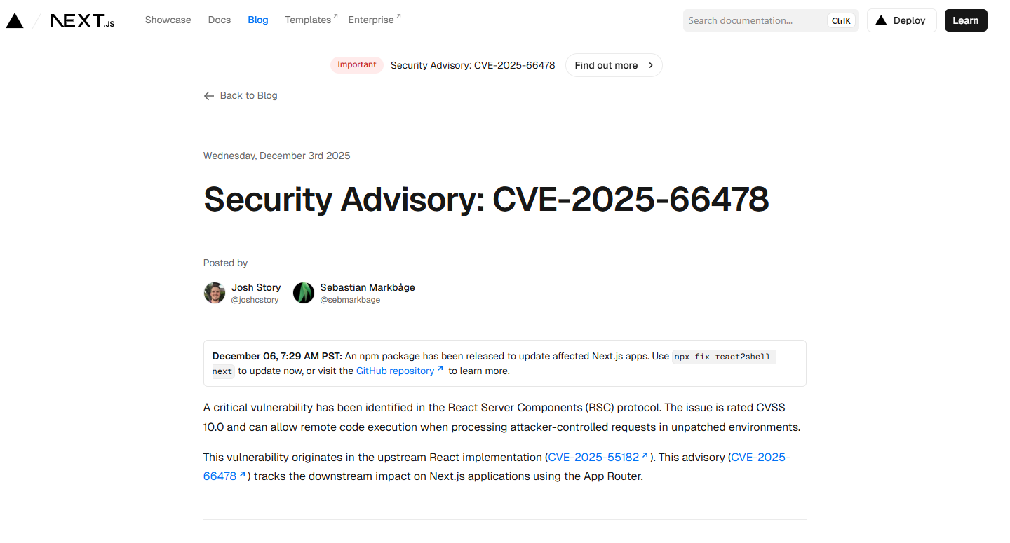 이어 12월 6일에는 Next.js 공식 블로그에서도 관련된 취약점을 공지하였다.