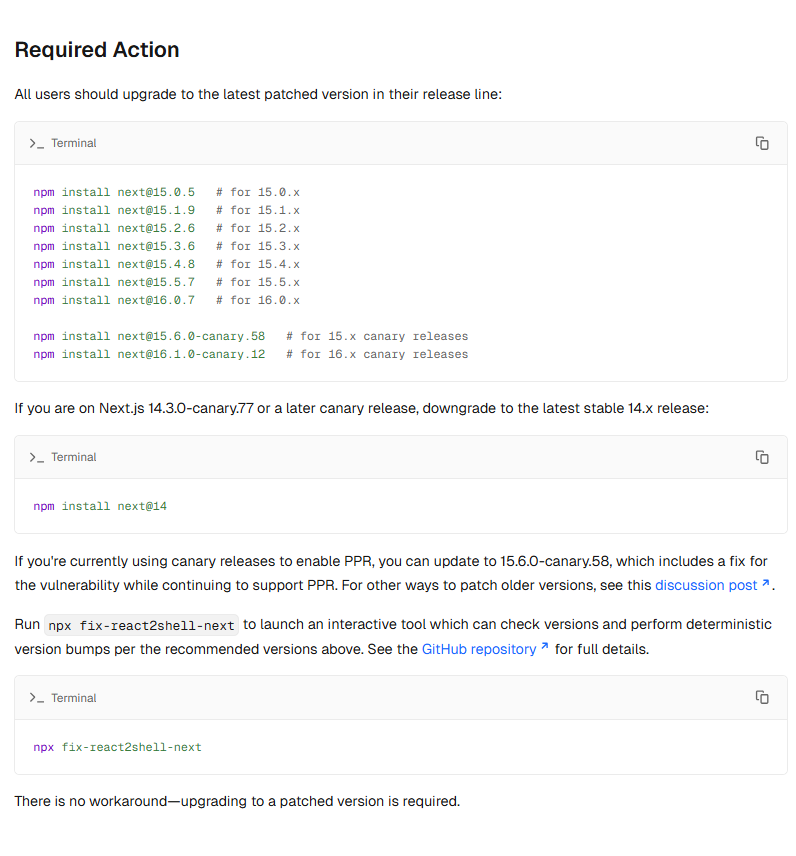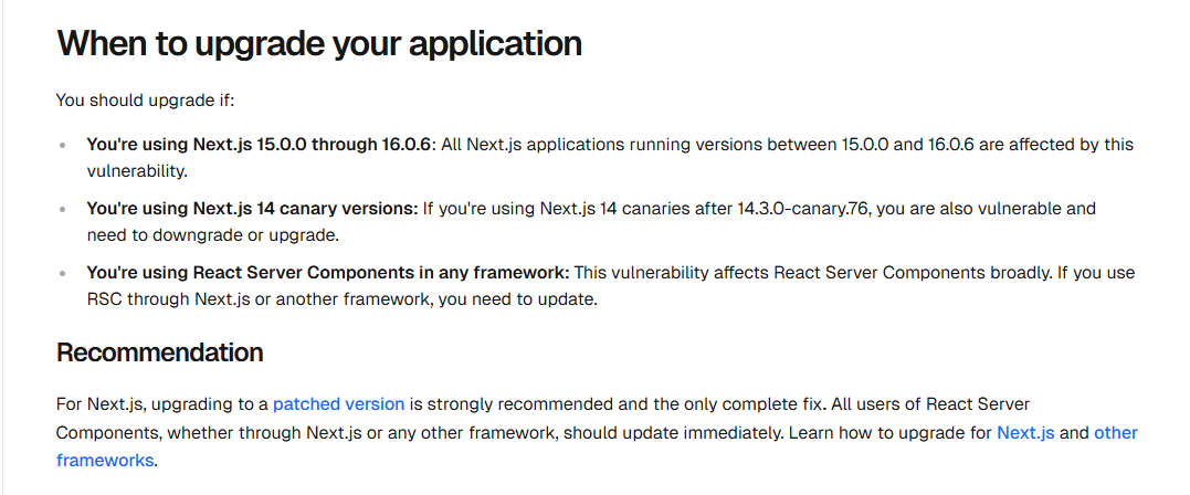 Vercel에 배포하는 경우, 해당 플랫폼은 이미 취약한 버전의 새로운 배포를 차단하고 WAF 규칙을 적용하고 있지만, 업그레이드는 여전히 중요합니다.