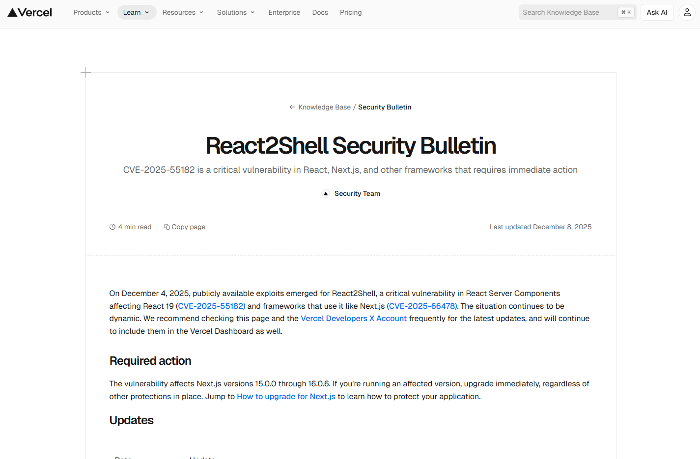 React2Shell Security Bulletin | Vercel Knowledge Base