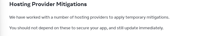 여기서 주의해야 할 점은 호스팅사가 제공한 임시 조치는 시간 벌기용일뿐, 근본적인 해결책은 아니므로 반드시 React와 RSC 패치를 적용해야 한다.