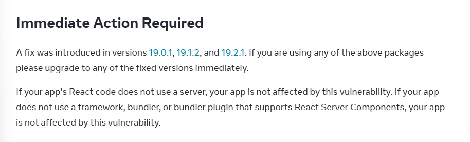 즉 React 19.0.1 / 19.1.2 / 19.2.1 중 하나 이상으로 업그레이드하면 안전하다.