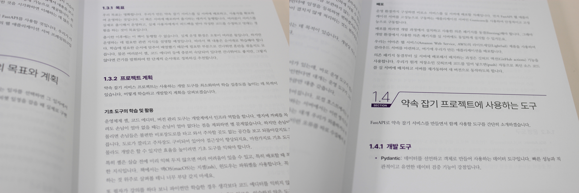 FastAPI라는 것을 설명하는 데 그치지 않고 하나의 웹 서비스를 기획하고 설계한 뒤 구현, 테스트, 운영, 베포까지 실제 서비스 개발의 사이클을 따라가도록 구성이 되어 있다.