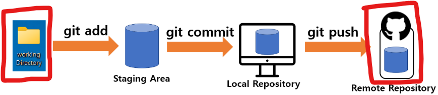 원격 저장소 ( Remote Repository) : Git의 목적은 파일 공유와 버전 관리이다. 원격 서버에 저장되어 관리되는 저장소이며, 파일이 원격 저장소 전용 서버에서 관리되면 여러 사람이 함께 공유하기 위한 저장소이다.