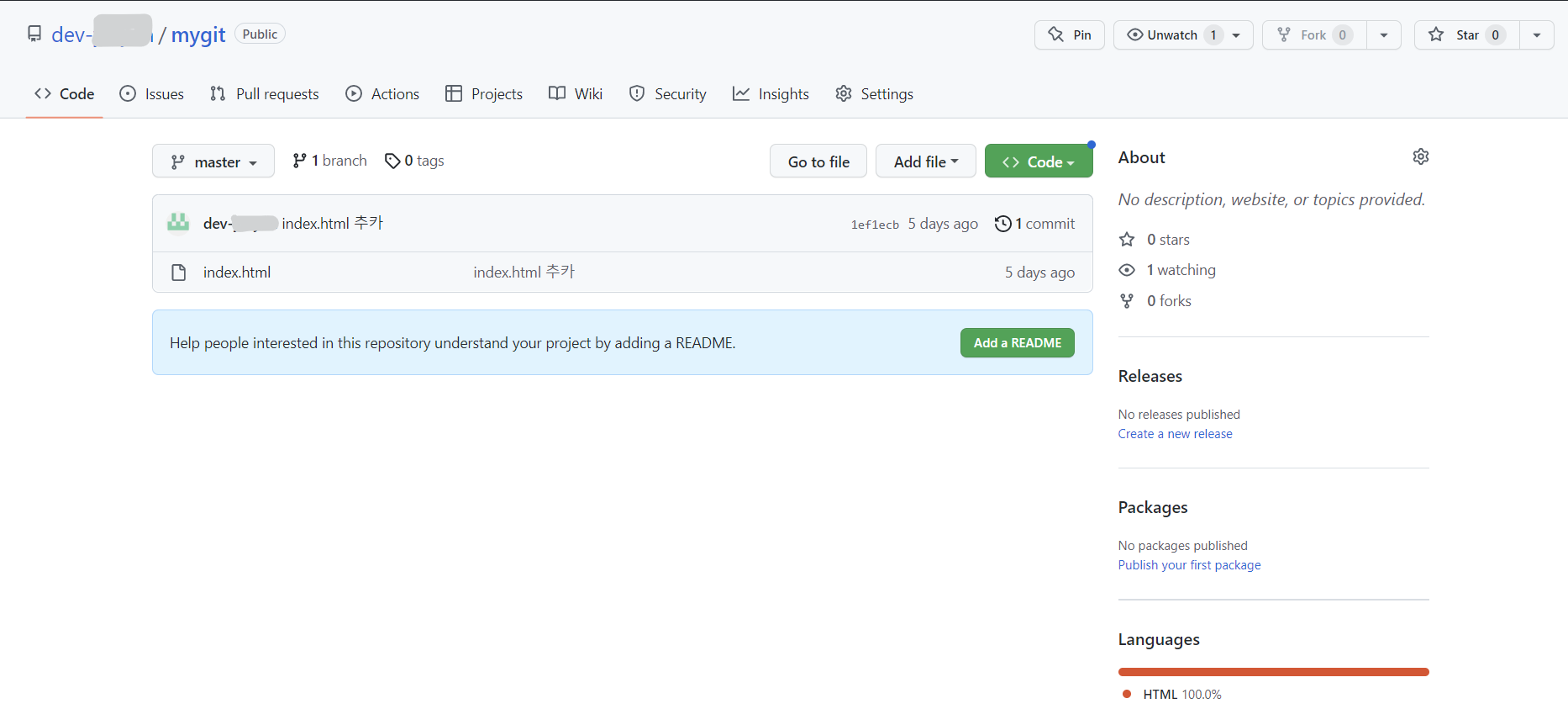 현재 로컬 저장소와 원격 저장소를 생성만 되어있는 상태입니다.
