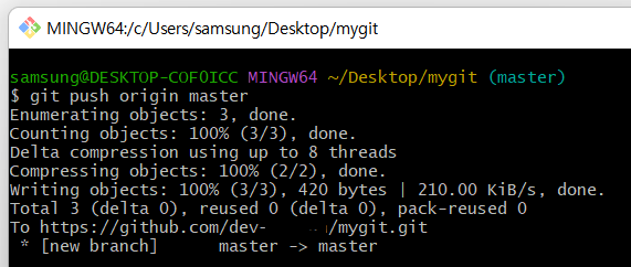 3. 커밋을 한 후 push 명령어를 통해 로컬 저장소에 있던 파일을 원격저장소에 업로드한다.