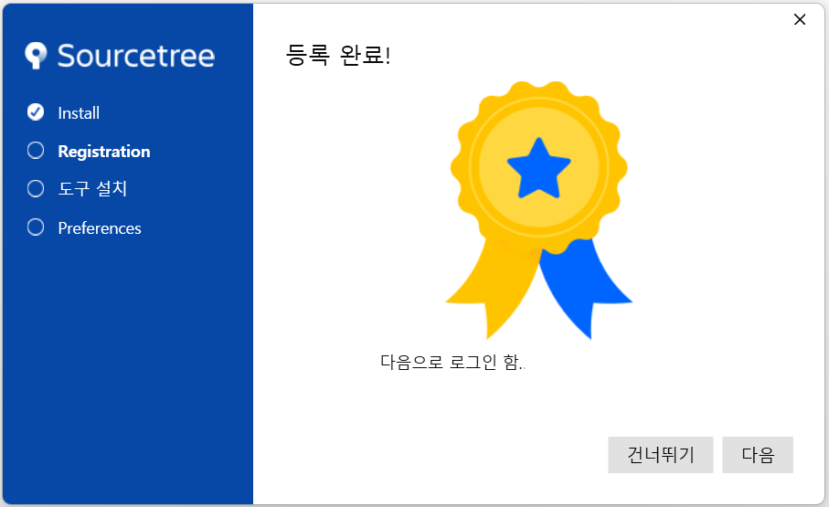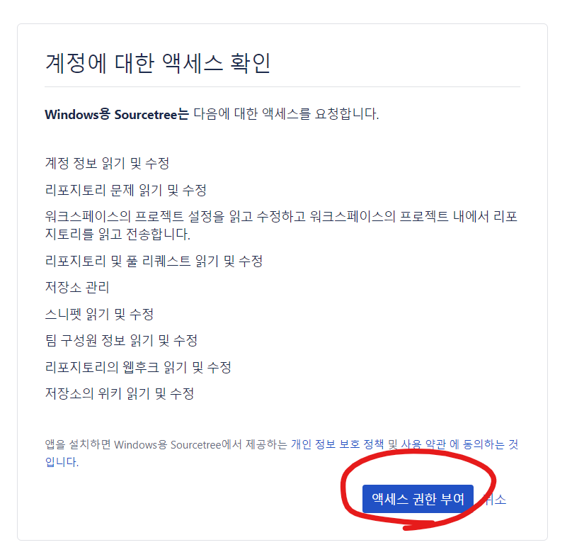 인증 성공이 완료되면 Source tree에서 등록을 완료해 줍니다. 다음 클릭