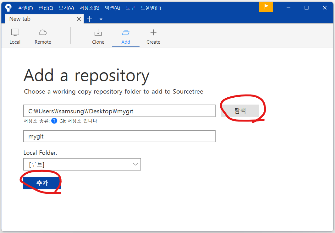 2. 탐색을 클릭하여 git 로컬 저장소 폴더를 선택 > 추가 클릭