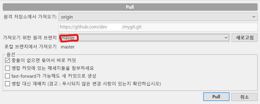 가져오기 위한 원격 브랜치를 master로 pull 한다.