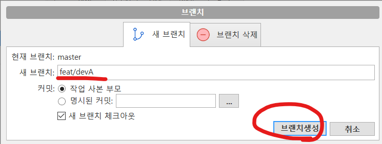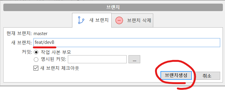 브랜치 명 입력 후 새 브랜치 생성 클릭