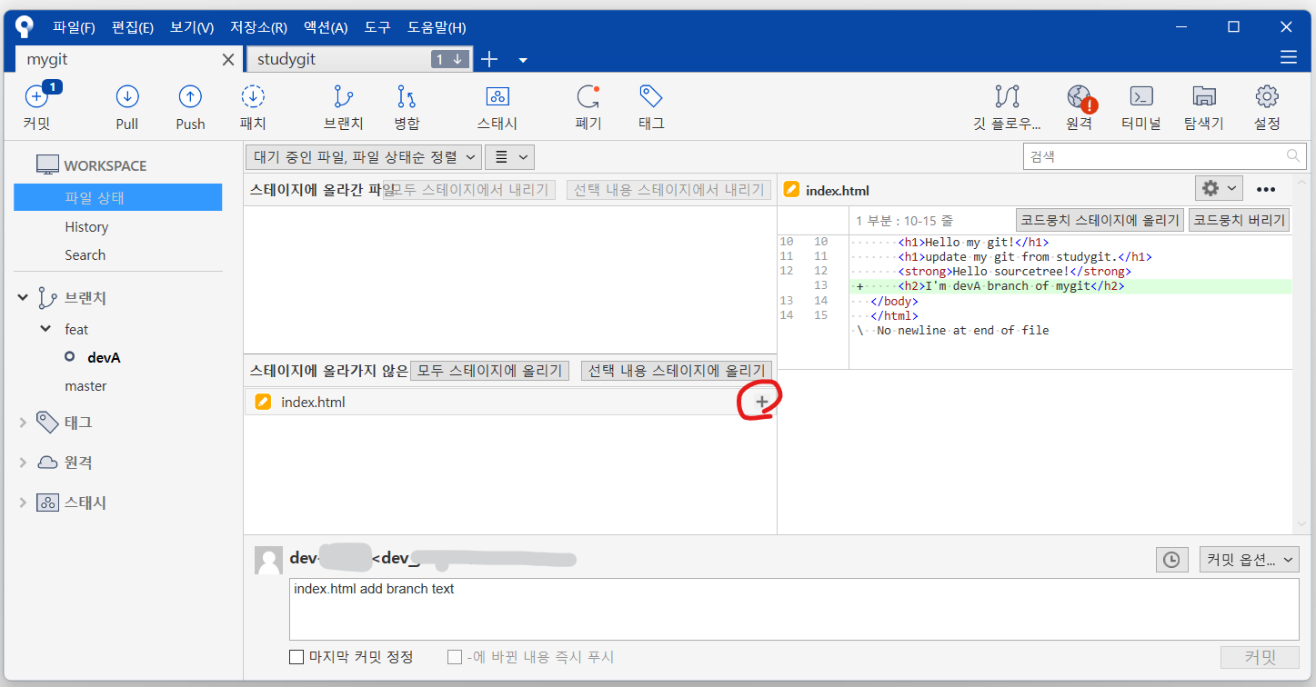 studygit 로컬 저장소에 브랜치가 feat/devA로 바뀐것을 볼 수 있다.