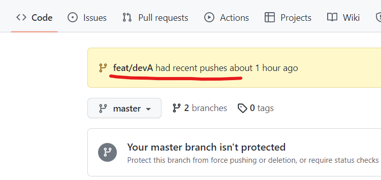 최근에 브랜치가 push하였다는 것을 알 수 있다.