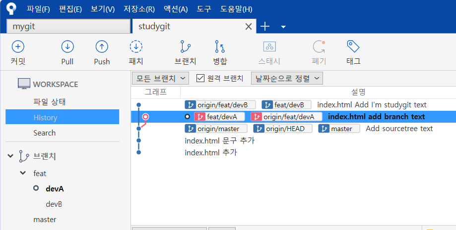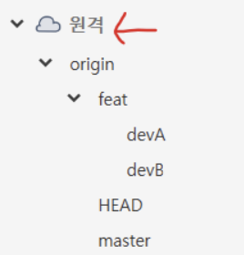 원격 탭을 열어서 origin 밑에 feat탭을 열면 devA와 devB를 볼 수 있습니다.