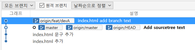 "Add sourcetree text" 커밋을 기점으로 feat/devA를 만들고 새로운 feat/devB를 만들 것이다.