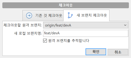 체크아웃할 원격 브랜치가 origin/feat/devA 브랜치이고, 이것을 내 컴퓨터에 가져올 로컬 브랜치명은 feat/devA이것을 볼 수 있다.