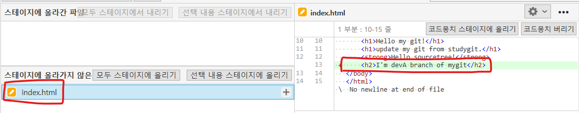 스테이지에 올라가지 않은 파일에서 수정된 index.html을 볼 수 있다.