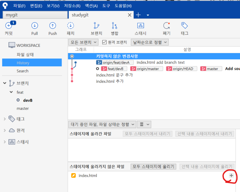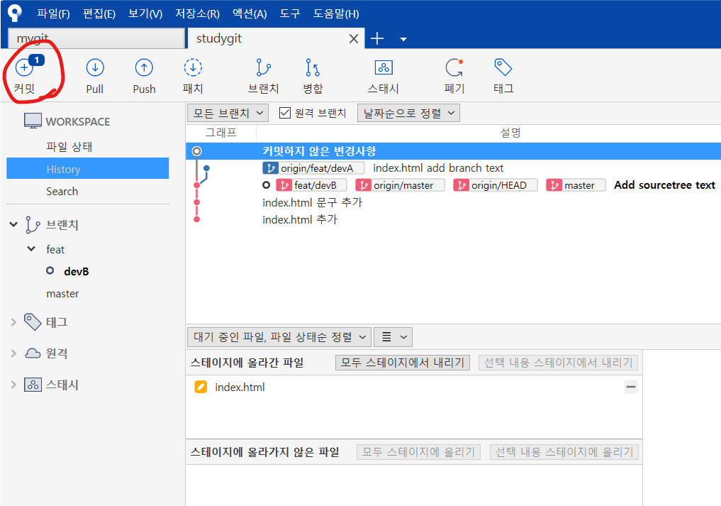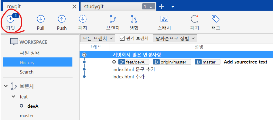 3. 소스트리에 커밋하지 않은 변경사항이 나타난다.