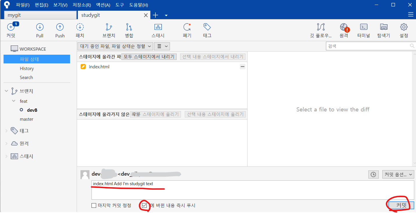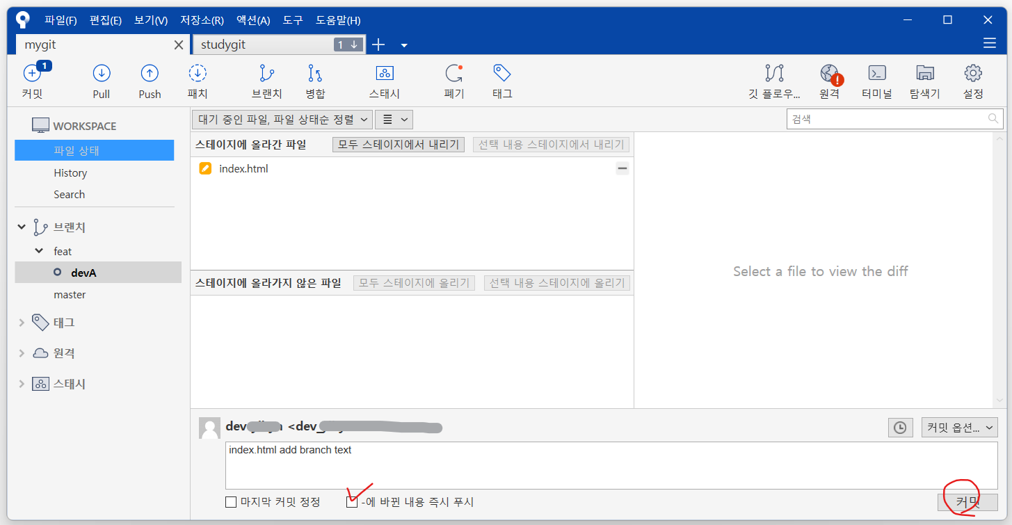 studygit 로컬 저장소에 브랜치가 feat/devA로 바뀐것을 볼 수 있다.