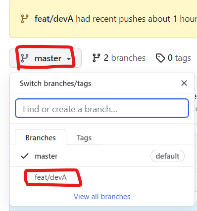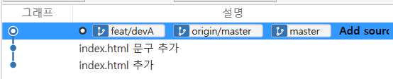 feat/devA 브랜치와master 브랜치 모두 최신 커밋을 가리키고 있다.