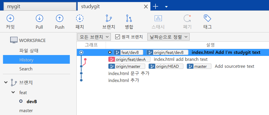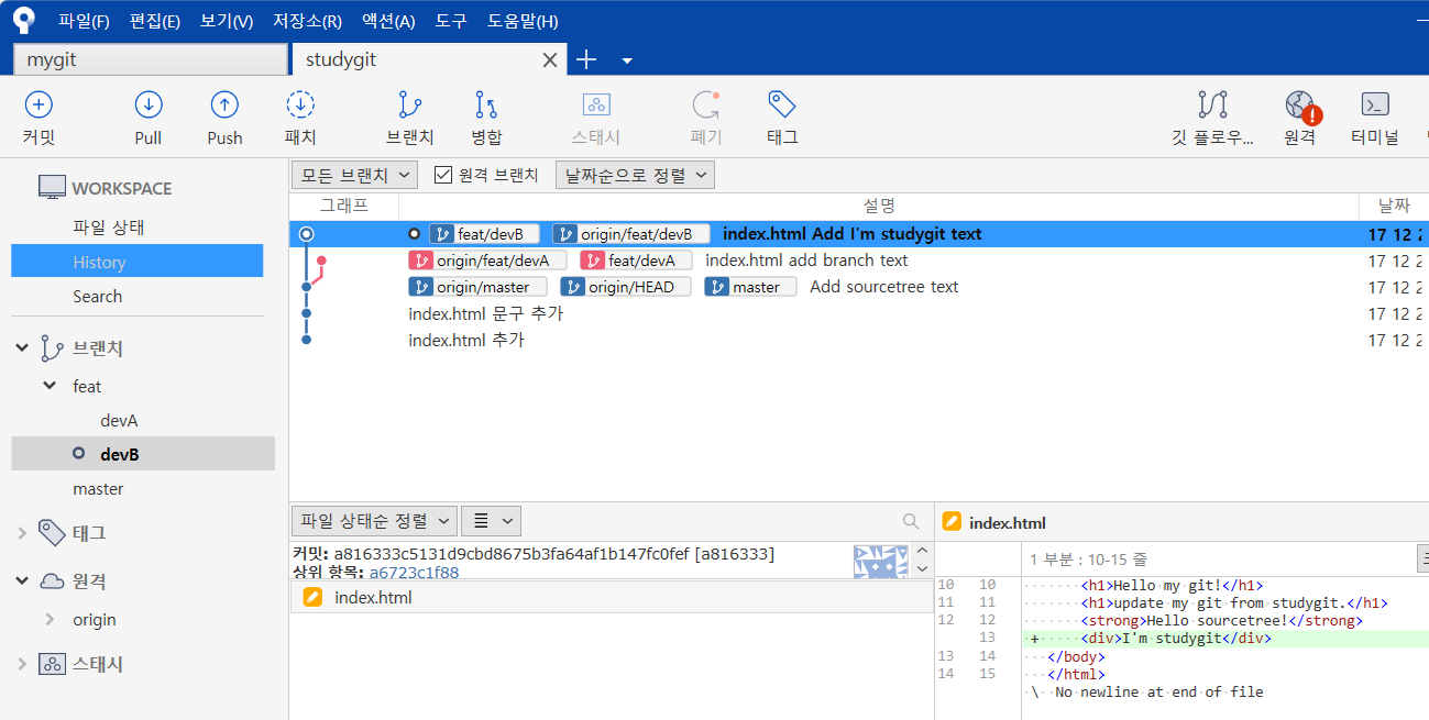다시 feat/devB로 돌아가고싶다면 브랜치에 있는 devB를 더블클릭하면 된다.