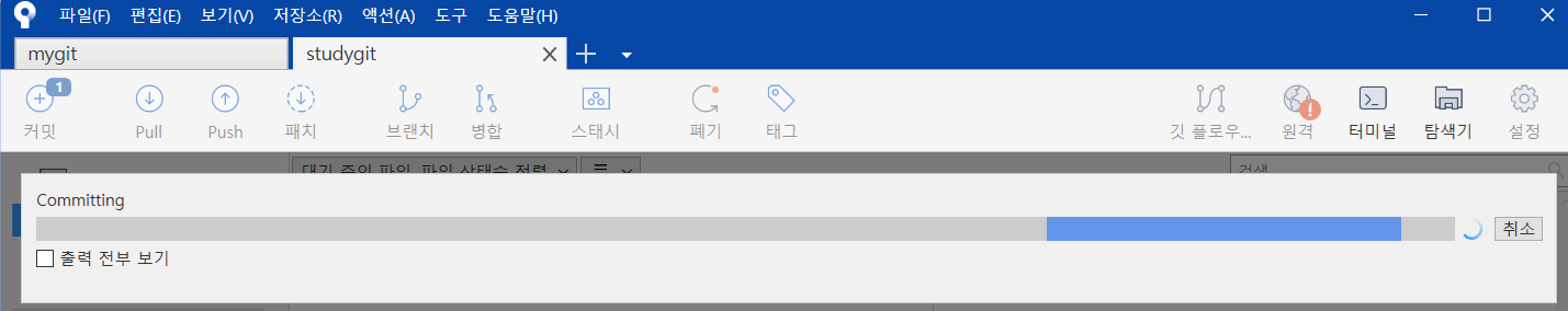 커밋 메시지를 입력 후 '바뀐 내용 즉시 푸시' 체크 후 커밋클릭