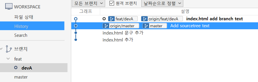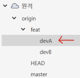 원격 탭을 열어서 origin 밑에 feat탭을 열면 devA와 devB를 볼 수 있습니다.