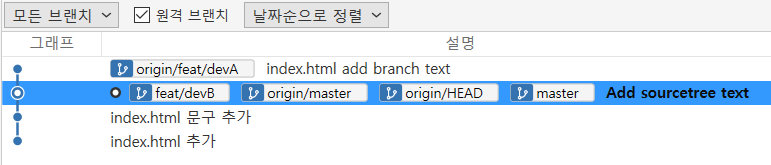"Add sourcetree text" 커밋을 기점으로 feat/devA를 만들고 새로운 feat/devB를 만들 것이다.