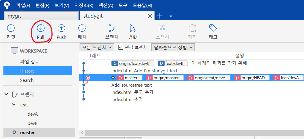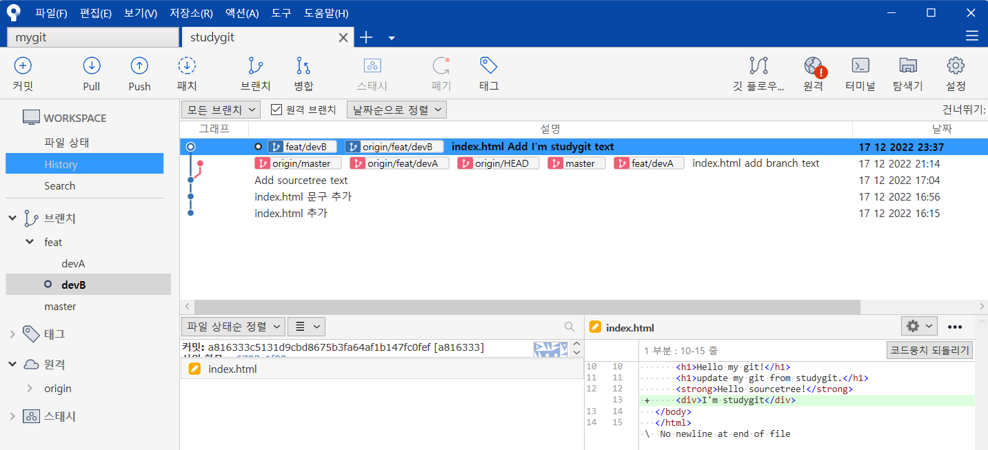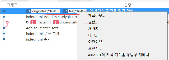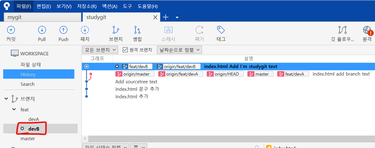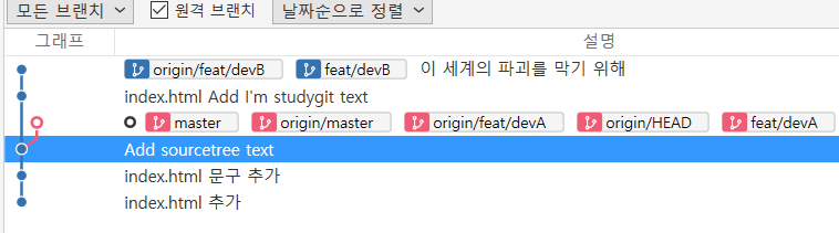 Add sourcetree text를 기점으로 master브랜치와 devB의 상태가 나눠져 있는 것을 확인할 수 있다.