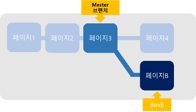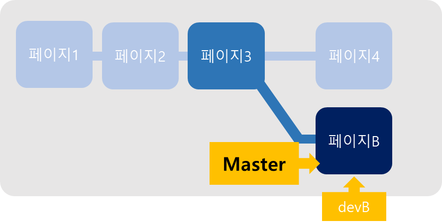 master 브랜치는 페이지3을 가리키고 있고 devB는 페이지B를 가리키고있다. |
