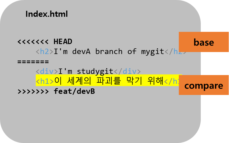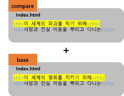 index.html 파일에 compare 브랜치에서는 '이 세계의 평화를 지키기 위해'라고 작성하였고 base 브랜치는 '이 세계의 파괴를 막기 위해'라고 작성하였다.