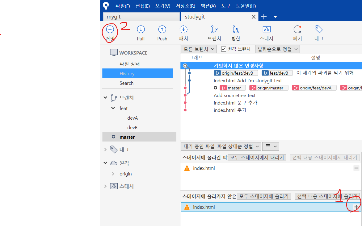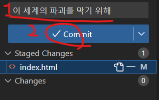 13. 커밋하지 않은 변경사항에서 index.html을 스테이지에 올린 후 커밋 버튼을 클릭한다.