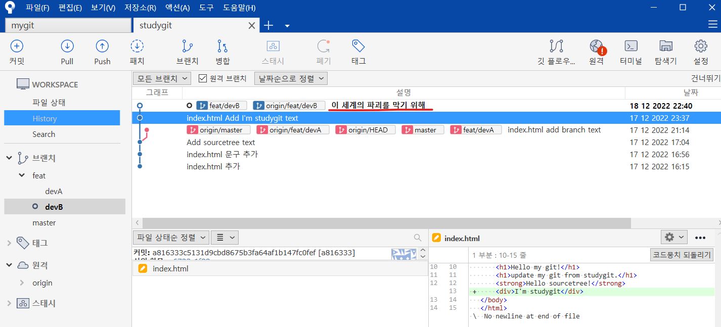 index.html을 클릭하면 어디가 수정되었는지 알 수 있다.