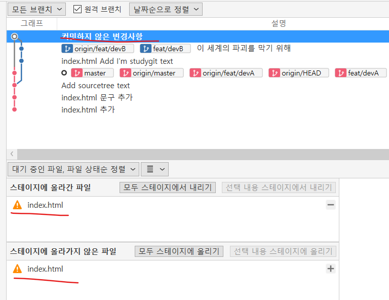 컨플리트가 난 파일은 커밋하지 않은 변경사항에 stage 아래에 있게 된다.