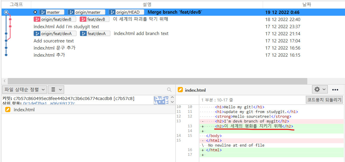 충돌 후 수정한 index.html을 볼 수 있다.