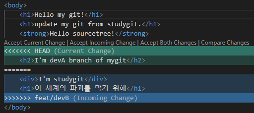 Merge 할 때 두 버전이 같은 곳을 수정하였다면 이를 수동으로 고쳐주어야 한다.