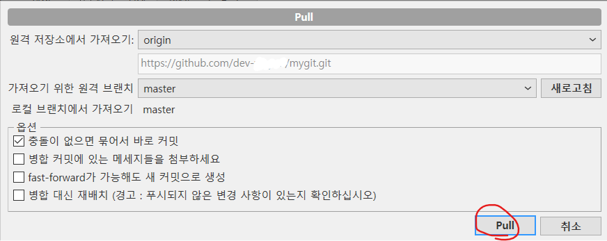 origin/master에 바뀐 내용 즉시 푸시 체크 후 커밋 버튼 클릭