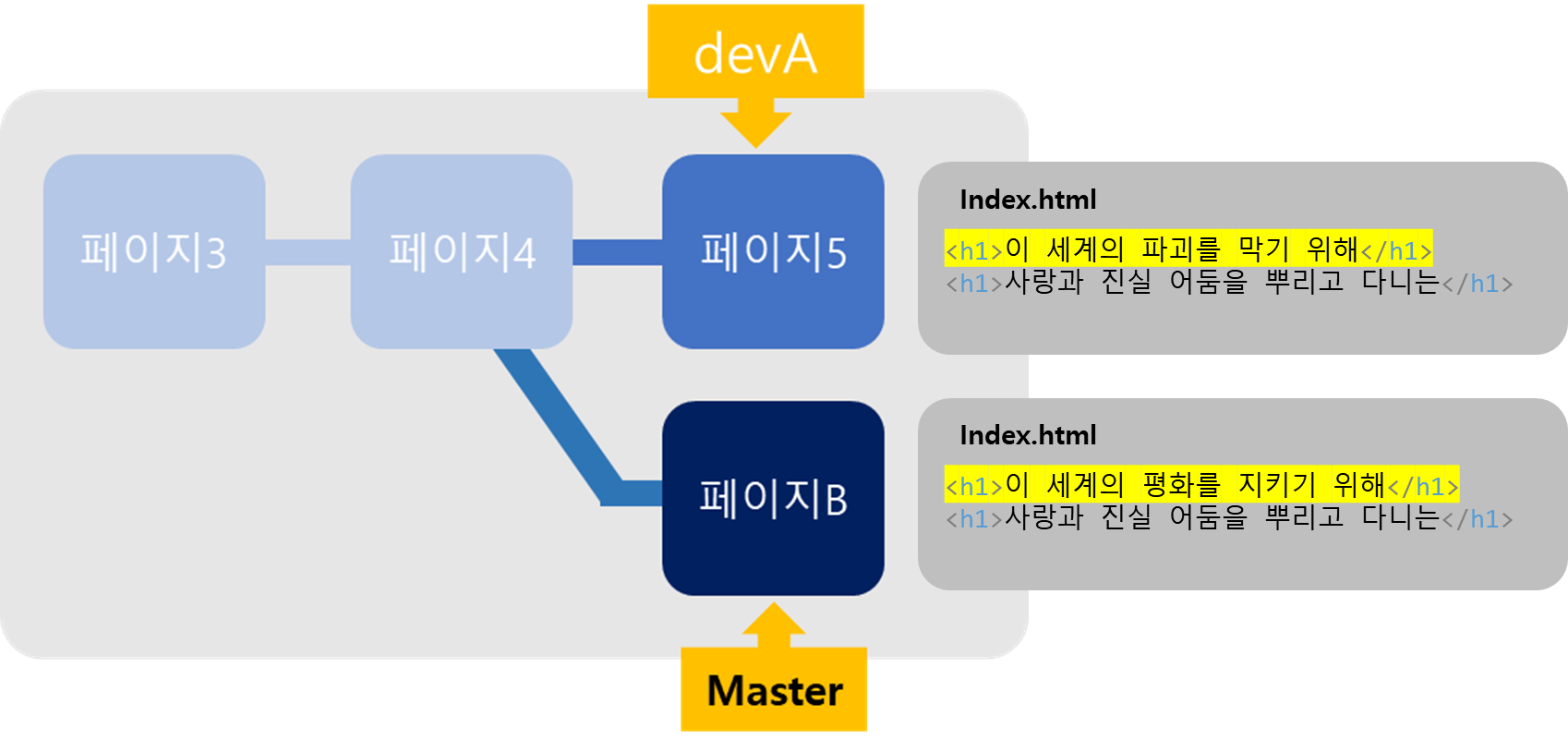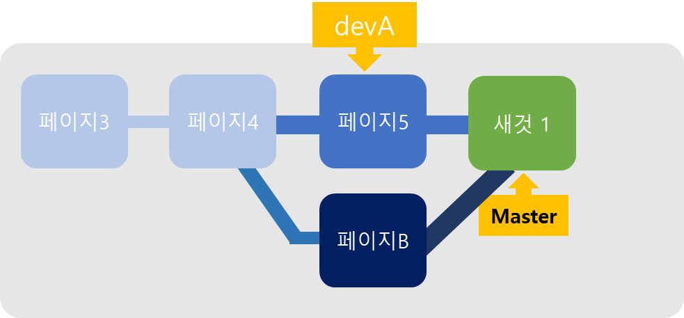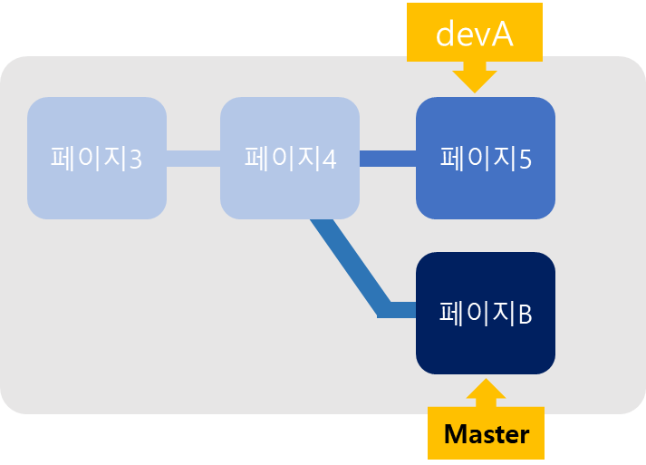 페이지4를 기준으로 master 브랜치와 devA브랜치의 상황이 나뉘게 되었다. |