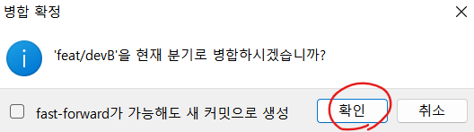11. merge를 원하는 대상인 feat/devB를 클릭한 후 병합을 클릭한다.