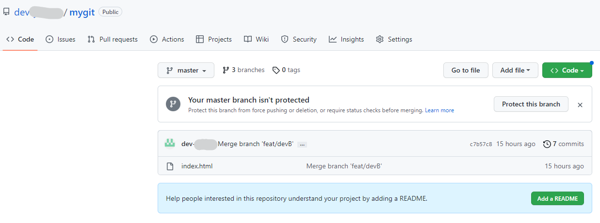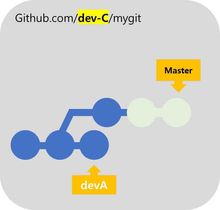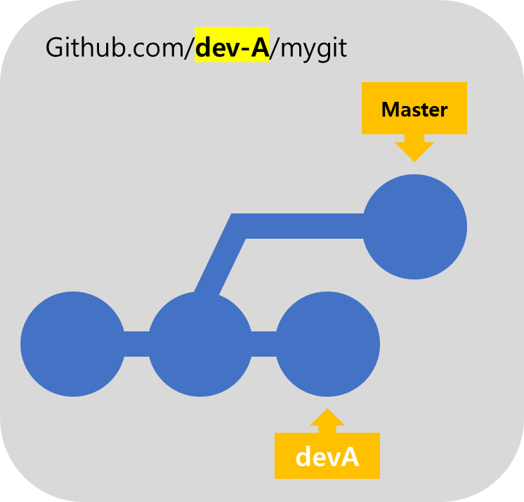 개발자 A의 mygit 저장소주소이다. devA브랜치와 master브랜치가있다. |