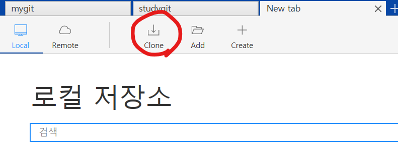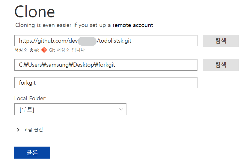 7. 복사했던 url을 붙여넣기 넣고 탐색을 클릭하여 로컬 저장소 생성 후 클론 버튼 클릭