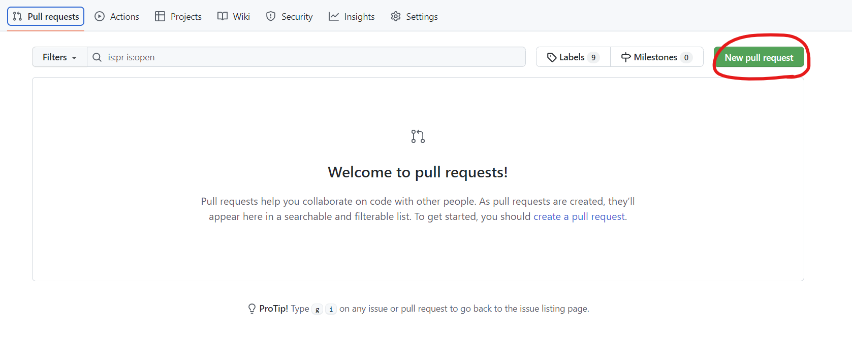 3. 깃허브 페이지에서 Pull request 메뉴에서 New pull request를 클릭한다.