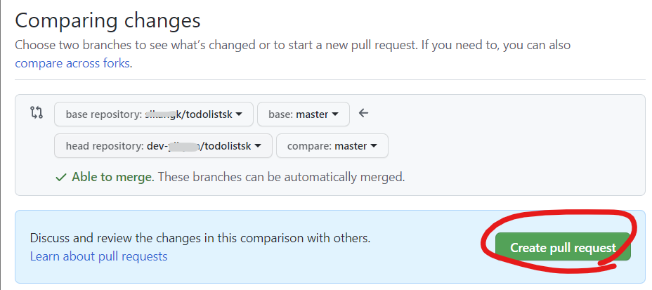 이떄 Able to merge라고 나타나는데 이것은 base 브랜치와 compare 브랜치가 충돌(conflict)나지 않는다는것을 알려준다.