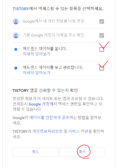 4. 데이터 보기 허용, 데이터 보고 관리 허용 체크 후 계속 클릭