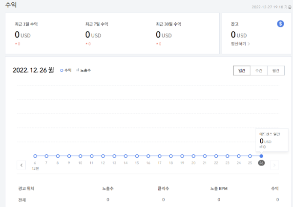 애드센스 관리에 들어가면 통계 및 수익을 확인할 수 있다.