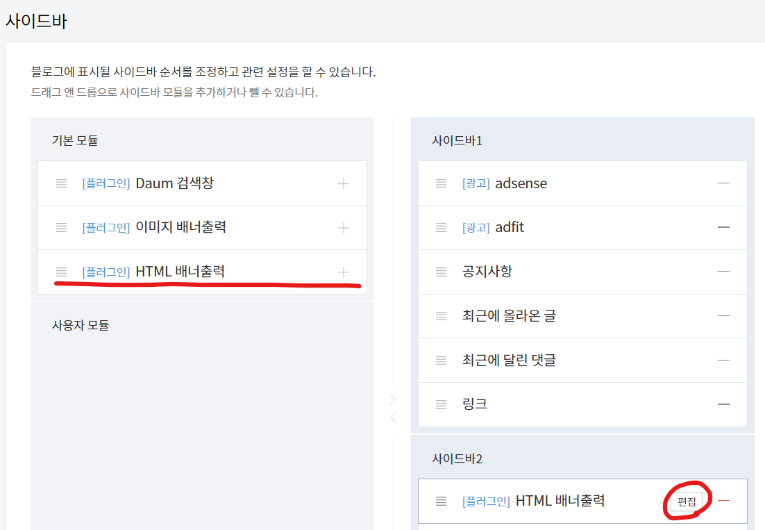 HTML 배너출력 + 버튼을 클릭하여 사이드바에 삽입 후 삽입된 사이드바에서 편집을 클릭합니다.